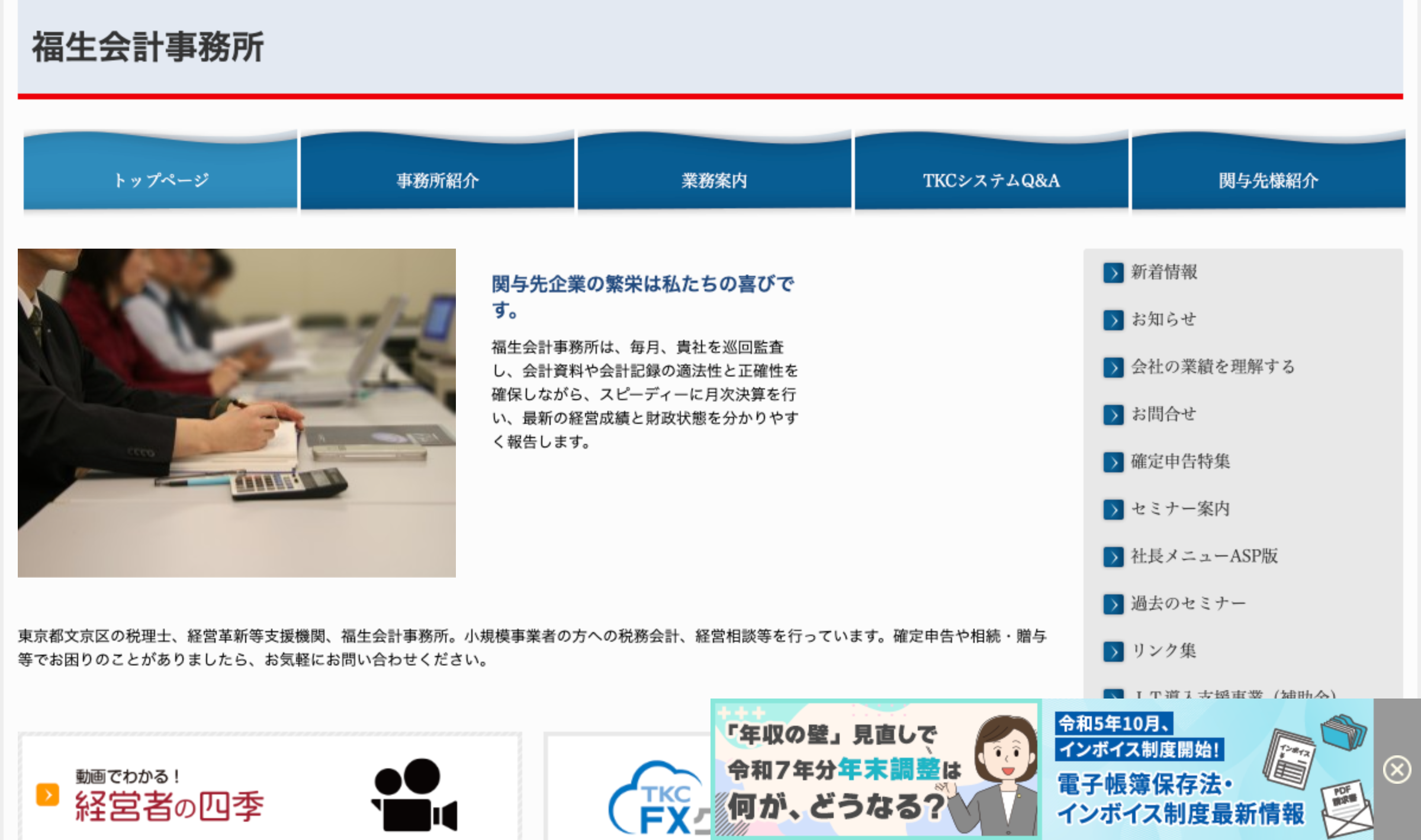 東京都文京区にある福生会計事務所は、「関与先企業の繁栄は私たちの喜び」を理念に、小規模事業者の方々を積極的にサポートする税理士事務所です。毎月の巡回監査を通じて会計資料の正確性を確保し、最新の経営成績を分かりやすく報告。決算申告書を作成するだけの税理士ではなく、お客様に有益なサービスを提供し、最善のパートナーとなることを目指しています。新規開業の方への無料メール相談も実施中です。