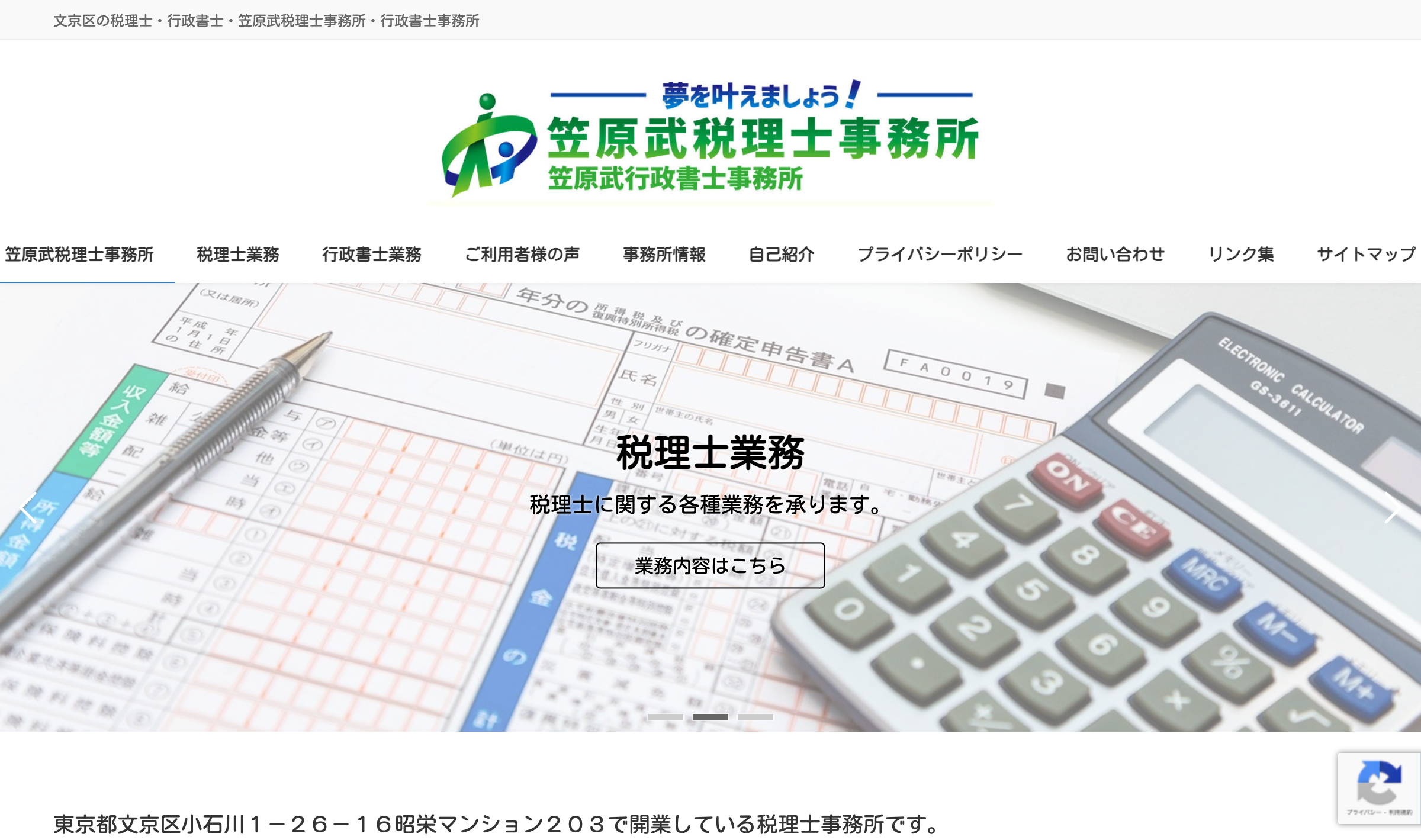 東京都文京区に地域密着し、「共に考えましょう!」を経営理念とする笠原武税理士事務所は、税理士業務と行政書士業務の両方に対応している事務所です 。税理士事務所勤務20年以上のベテランが、お客様と悩みを共有し、親身になってサポート。自計化(記帳指導)を得意としつつ記帳代行にも積極的で 、実務経験に基づき税務調査に強い事務所です 。お客様の会社に合わせた経営コンサルティングも提供しています。