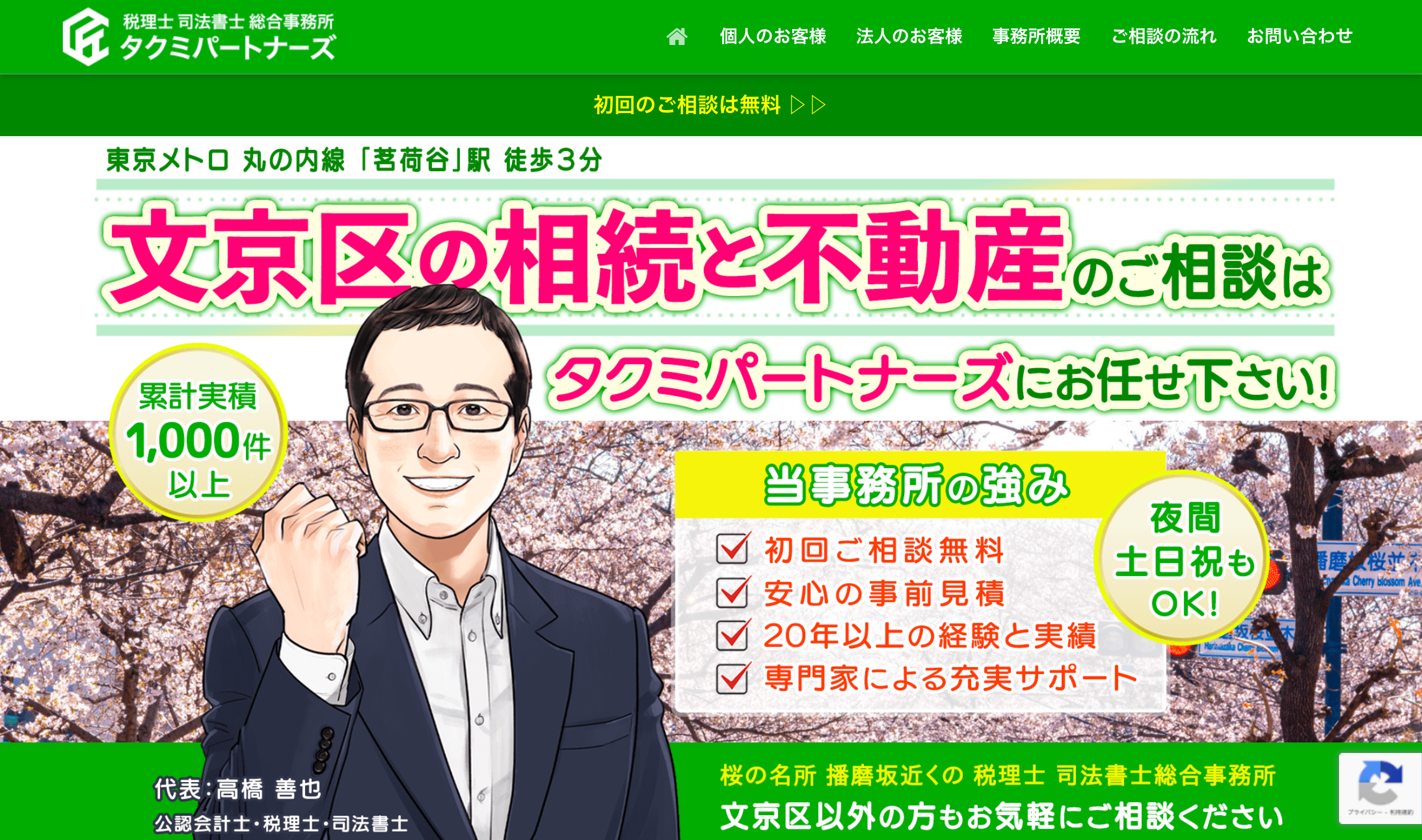 東京都文京区にある税理士 司法書士総合事務所 タクミパートナーズは、公認会計士、税理士、司法書士の資格を持つ代表が率いる総合事務所です。特に文京区の相続に強く、税務・会計、法務、登記、不動産関連業務など幅広く経験を積んだ専門家が対応します 。富裕層に対する節税スキームの提供や相続対策を多数手がけており、この地域の方々のお悩み解決に精通している税理士事務所です。