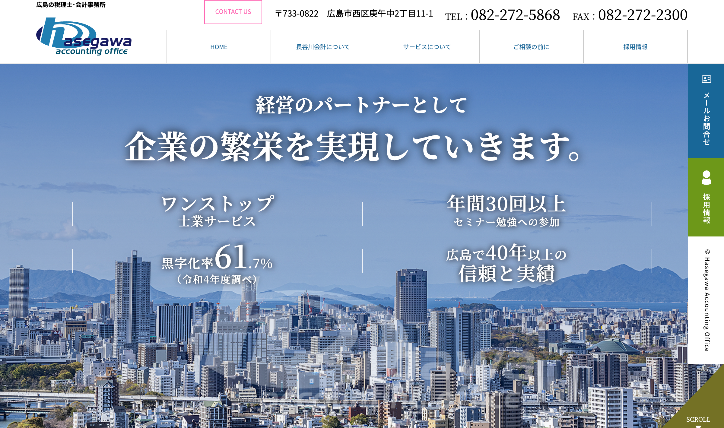税理士法人 長谷川会計は、40年以上にわたり培ってきた地域での信頼と、高い黒字化率実績を持つ、広島市を代表する税理士法人です。税務・会計の枠を超え、士業連携によるワンストップサービスと専門チーム体制で、経営のあらゆる課題を解決に導きます。常に知識をアップデートするための年間30回以上の勉強会参加にも熱心で、企業の永続的発展を力強く支援するパートナーとして、自信を持ってお勧めします 。