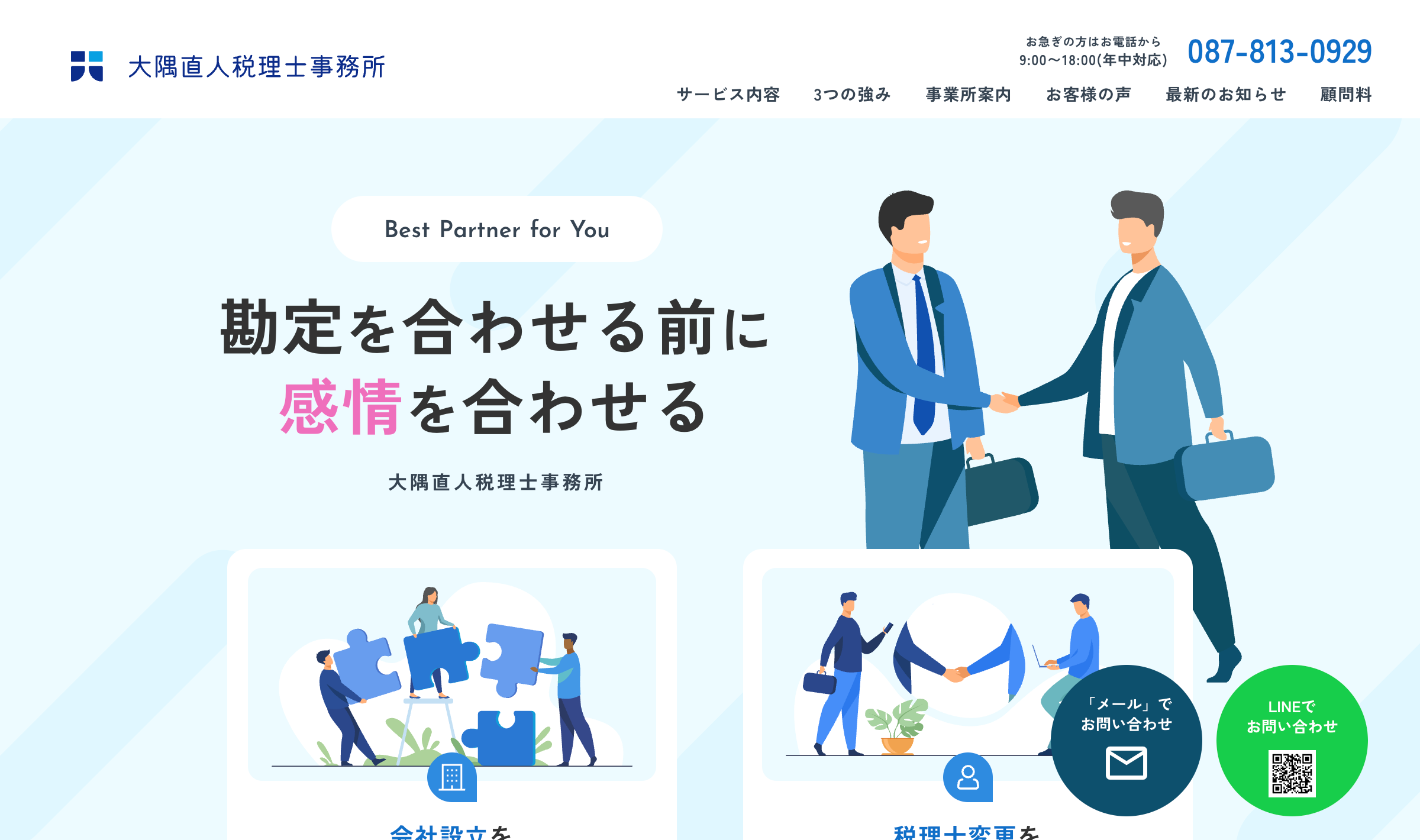 明確な見積もりの事前提示を徹底しています。平日の夜間や土日祝日の面談に柔軟に対応しているほか、香川県内であれば自宅など指定の場所への無料出張訪問も行っており、顧客に寄り添う対応が魅力の会計事務所です。