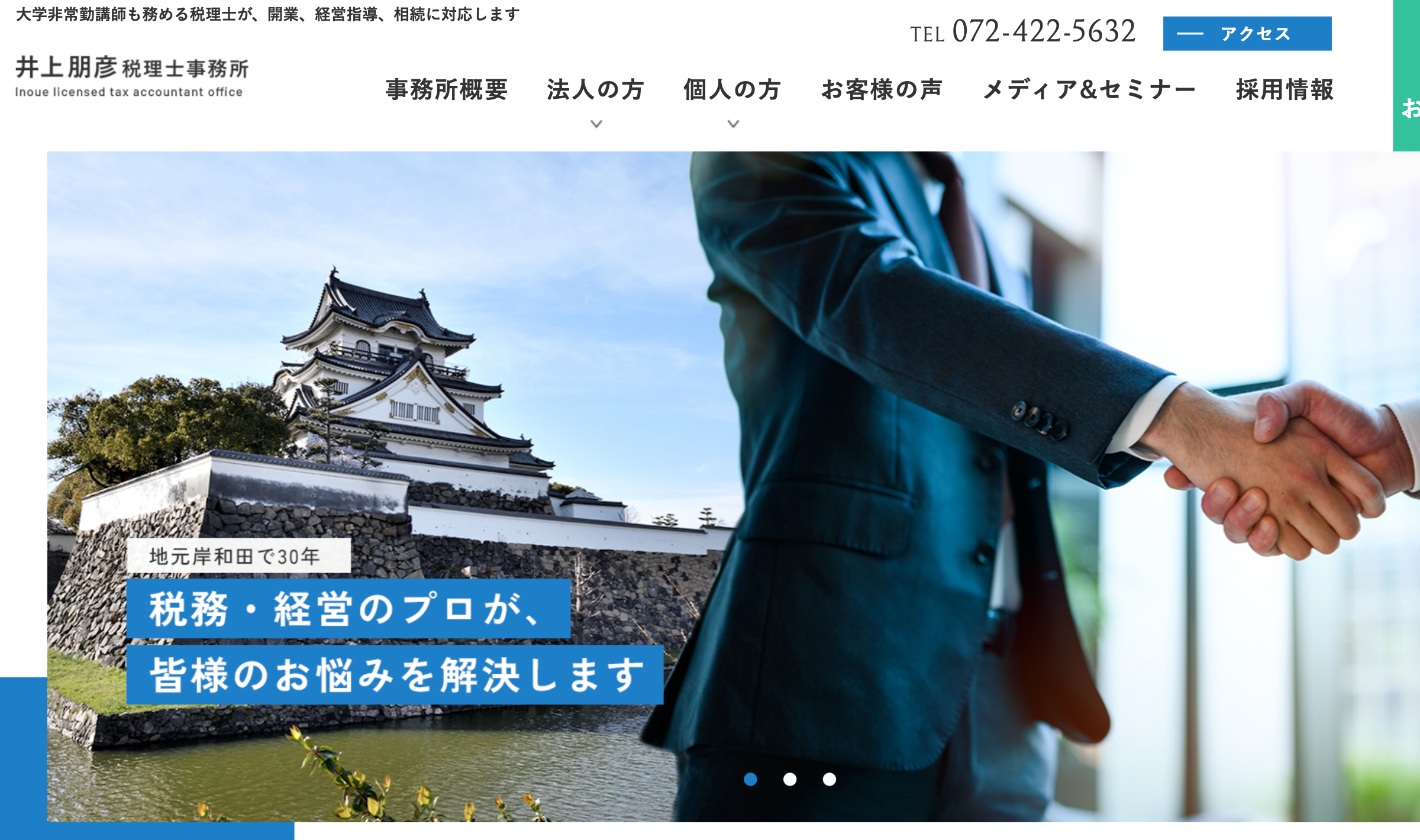 大阪府岸和田市を拠点とする井上朋彦税理士事務所は、関西大学総合情報学部で非常勤講師も務める所長が、経営者や資産家の「人生」を豊かにすることを念頭に活動しています。会計や税金だけでなく、「コンサルティング」に注力しており、開業・経営指導・相続に関するご相談に幅広く対応しています。累計1,100件以上の相続相談実績や90社以上の経営指導実績があり、スピード対応、お客様目線、幅広いネットワークによる提案力が強みです。