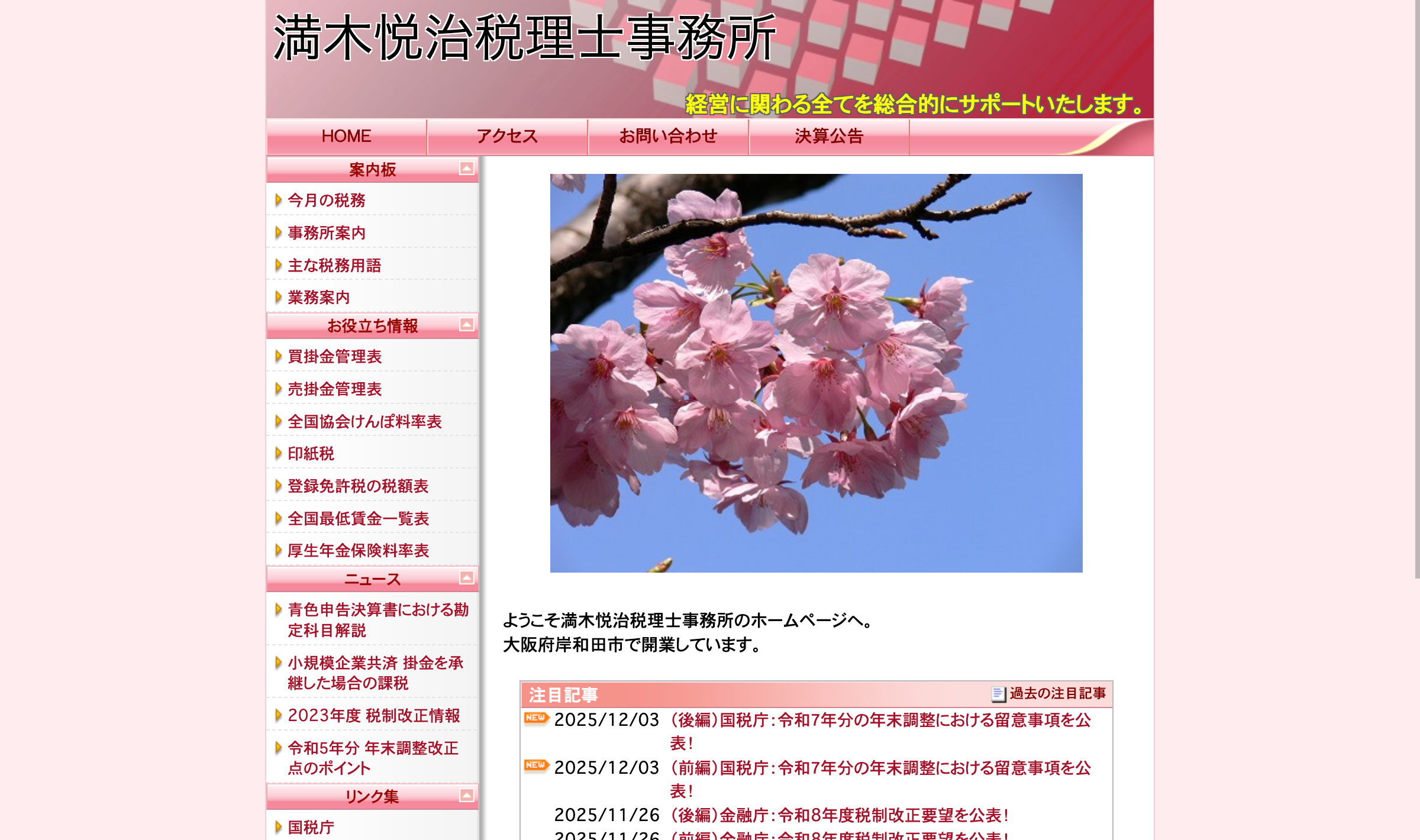 満木悦治税理士事務所は、顧問先企業の成長こそが自身の使命であると考え、日々の税務会計から経営の総合的なサポートまで、幅広く対応しています。最新の税制改正情報やお役立ちツールをウェブサイトで発信しており、お客様の事業運営を多角的に支援する姿勢が伺えます 。大阪府岸和田市で、企業の成長を力強くバックアップしてくれるパートナー税理士をお探しの方に、満木悦治税理士事務所をお薦めします。