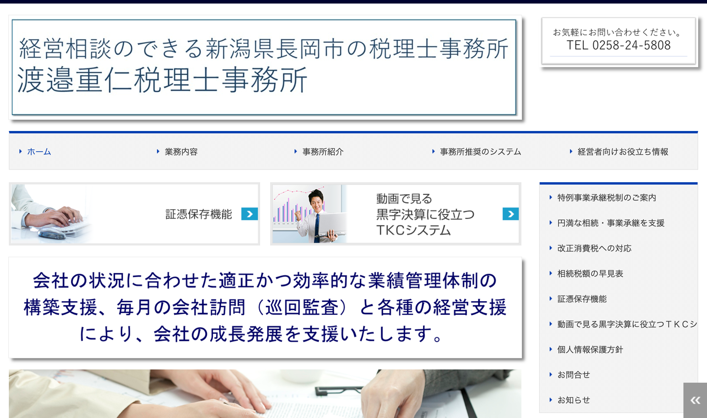 新潟県長岡市を中心に、中小企業の永続的発展を目標に掲げる税理士事務所です。我が国最大級の職業会計人集団であるTKC全国会に属し、経理・月次決算・経営計画の指導、相続・事業承継まで幅広く支援しています。所内には社会保険労務士と行政書士も在籍しており、労務や経営改善、資金繰りの相談もワンストップで対応可能です。