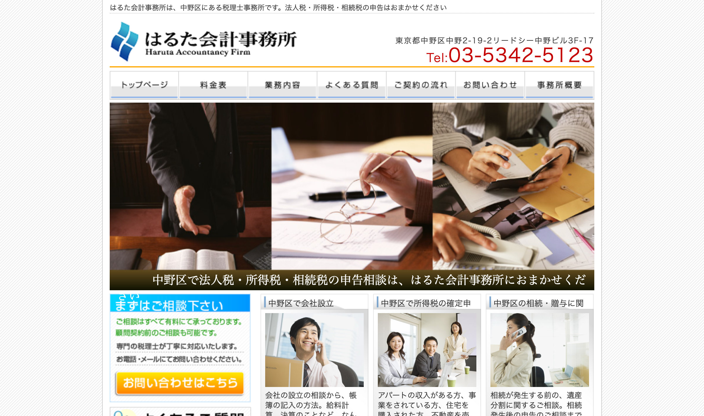 中野区に位置し、「ひたすら誠実 且つ良心的なサービスの提供に徹し、お客様との友好関係を維持する」をモットーとする税理士事務所です。会社経営、税金、資金繰り、相続対策などあらゆる悩みに応じ、相談料は無料で受け付けています。