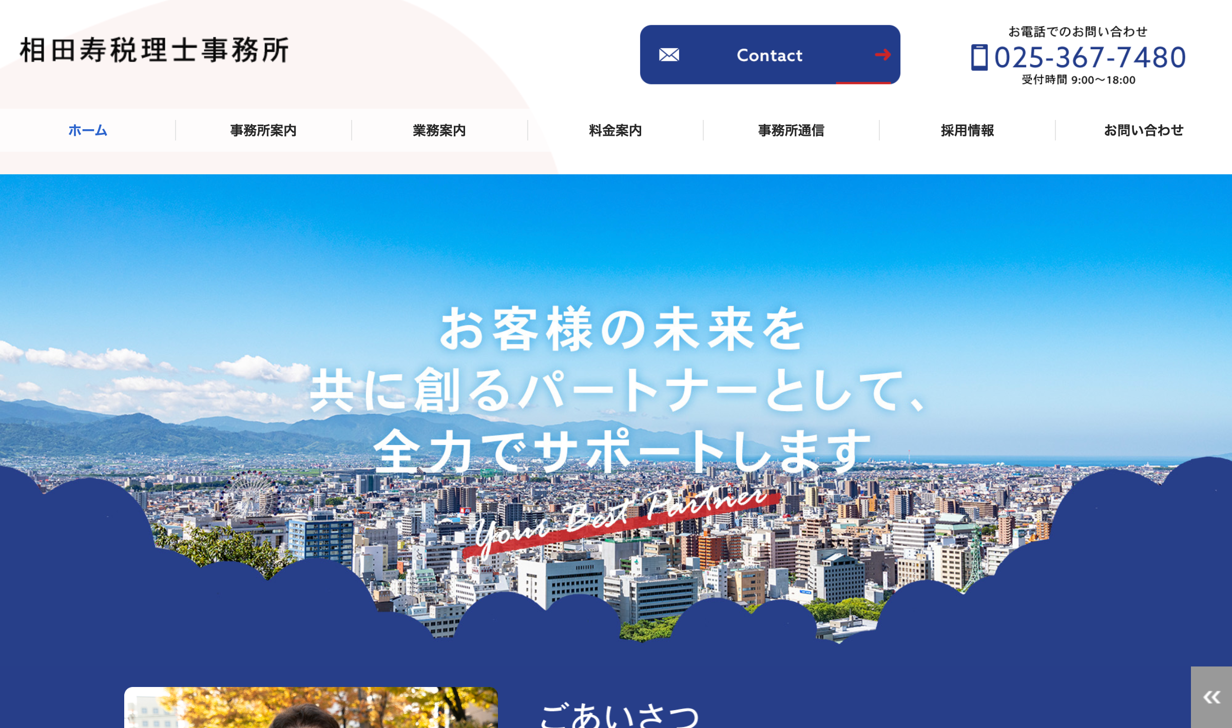 新潟市中央区に拠点を置く相田寿税理士事務所は、所長がすべての業務に責任を持って対応するひとり税理士体制が特徴の税理士事務所です。担当者の変更がなく、一貫して質の高いサービスを受けられるため、深く信頼関係を築きたい経営者に適しています。長年の豊富な経験を活かし、事業承継や組織再編、日々の経理指導からクラウド会計の導入まで幅広く対応。経営者のいちばん身近なパートナーとして企業の成長と発展を力強くサポートしてくれる事務所です。