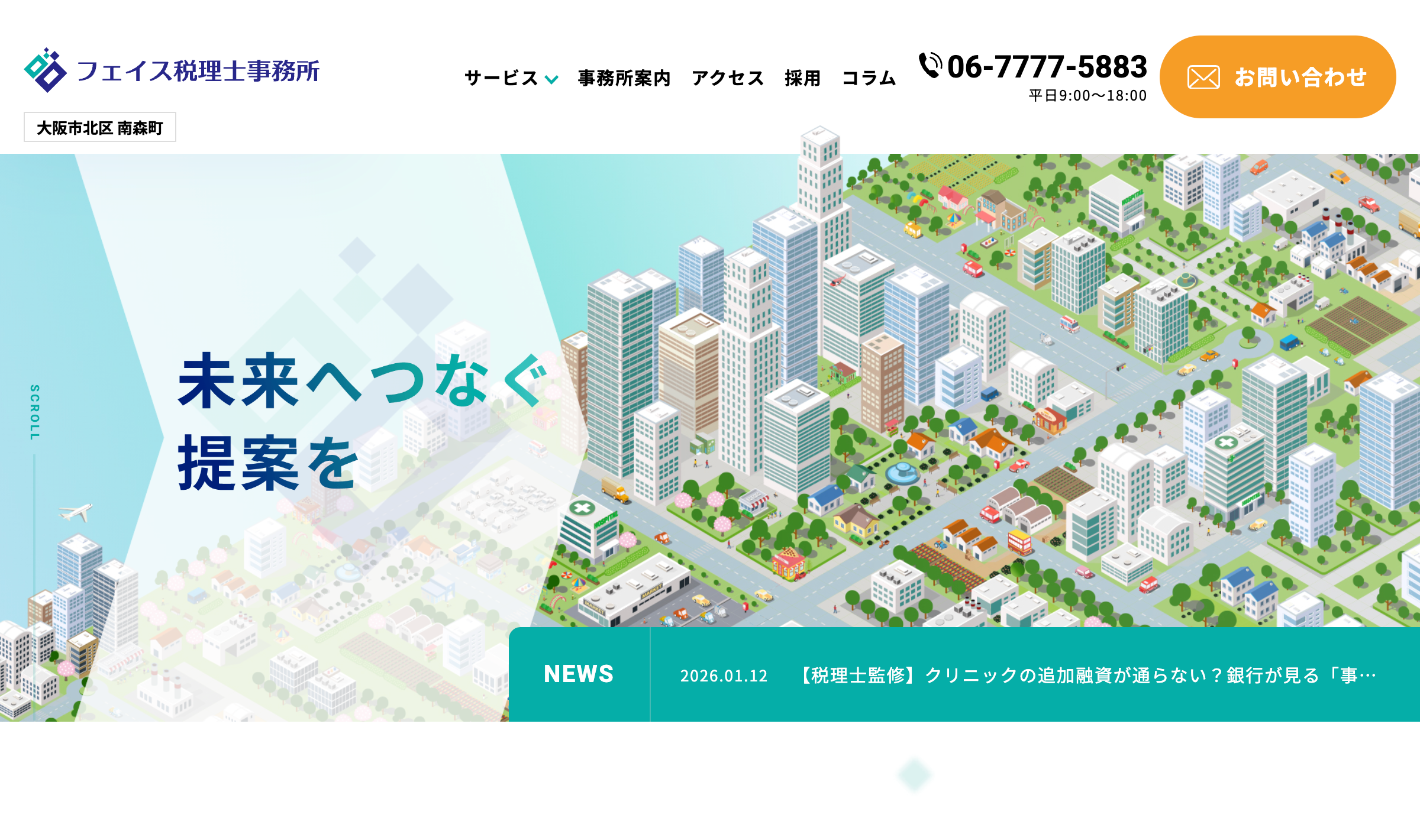 大阪市北区に拠点を置くフェイス税理士事務所は、中小企業や医療機関の経営を強力にバックアップしてくれる税理士事務所です。代表税理士はMBAを保有し、財務や補助金の認定アドバイザーとしても活躍しています。特に資金調達や補助金申請支援において豊富な実績を誇り、多角的な視点から経営課題の解決へと導いてくれます。各種専門家と連携したワンストップ体制を整えているのが魅力です。
