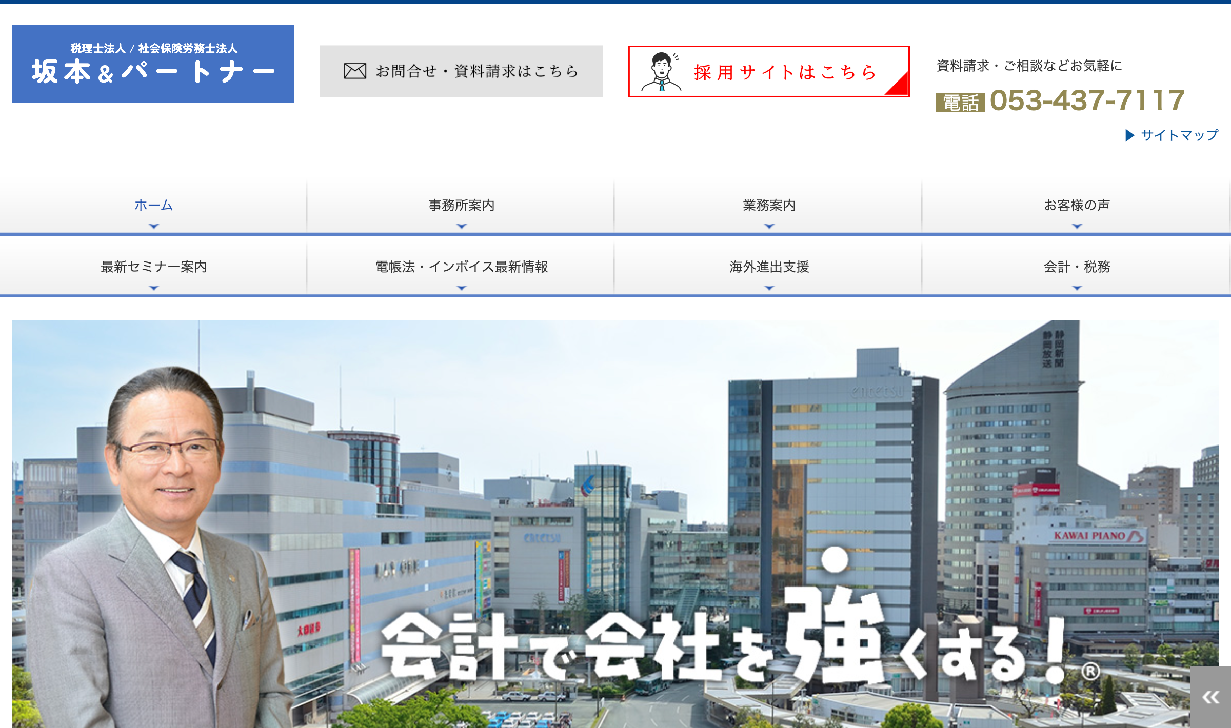 浜松市中央区に拠点を置く税理士法人坂本&パートナーは、会計で会社を強くするという理念のもと、幅広い顧客をサポートしている税理士法人です。税理士や公認会計士、中小企業診断士など多様な専門家が多数在籍し、ワンストップで高度なサービスを提供しています。安易な記帳代行を行わず、毎月の巡回監査と自計化支援を通じて、経営者が自社の業績を正確かつ迅速に把握できる体制づくりを徹底して支援するのが特徴。日本の会計事務所業界で初めてISO9001を認証取得するなど、質の高い業務提供に定評があります。