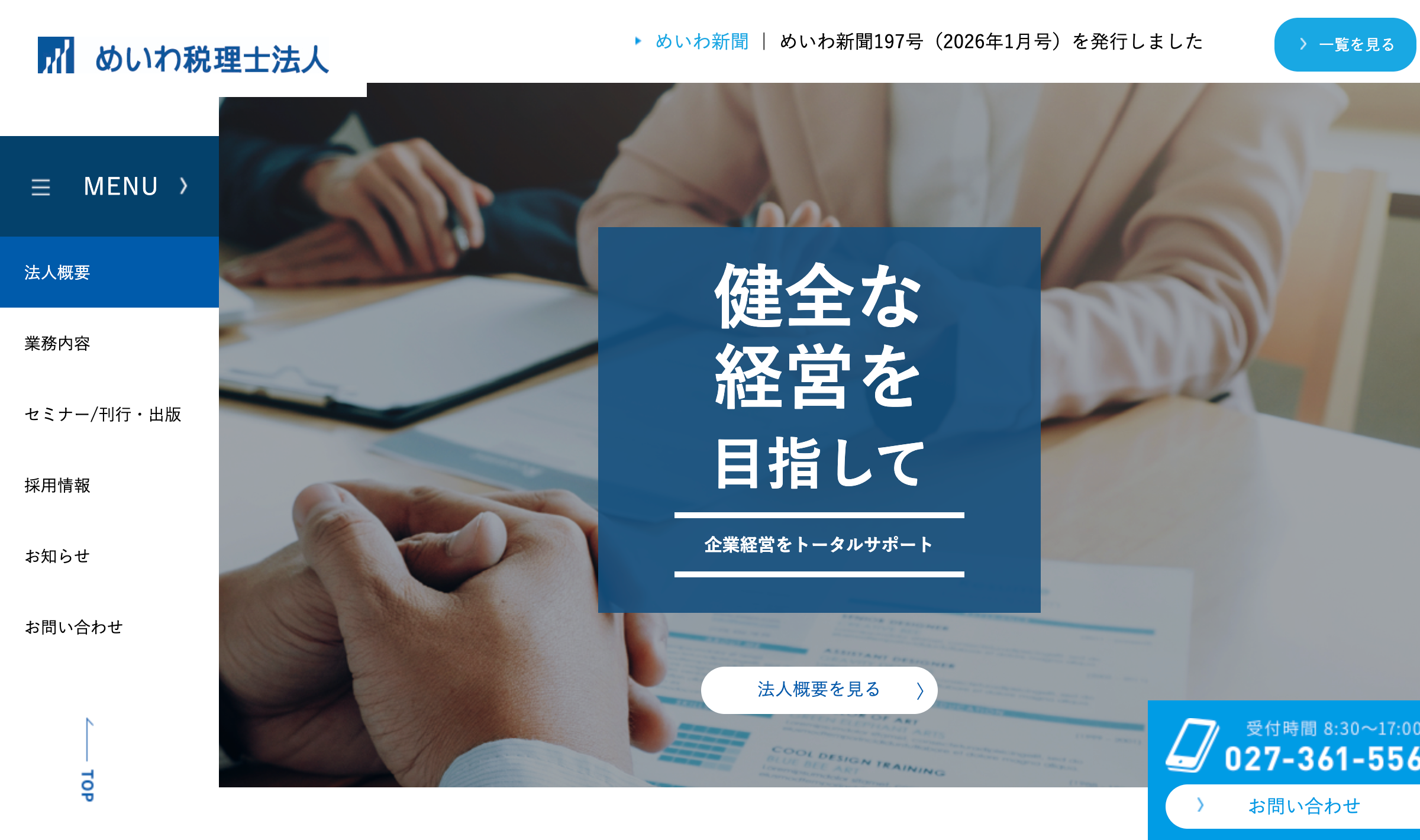 「めいわ新聞」の発行や定期的な企業経営セミナーを通じて、常に最新の税務・会計・経営情報を発信。専門的な内容を身近に感じられるよう工夫された、信頼ある事務所です。