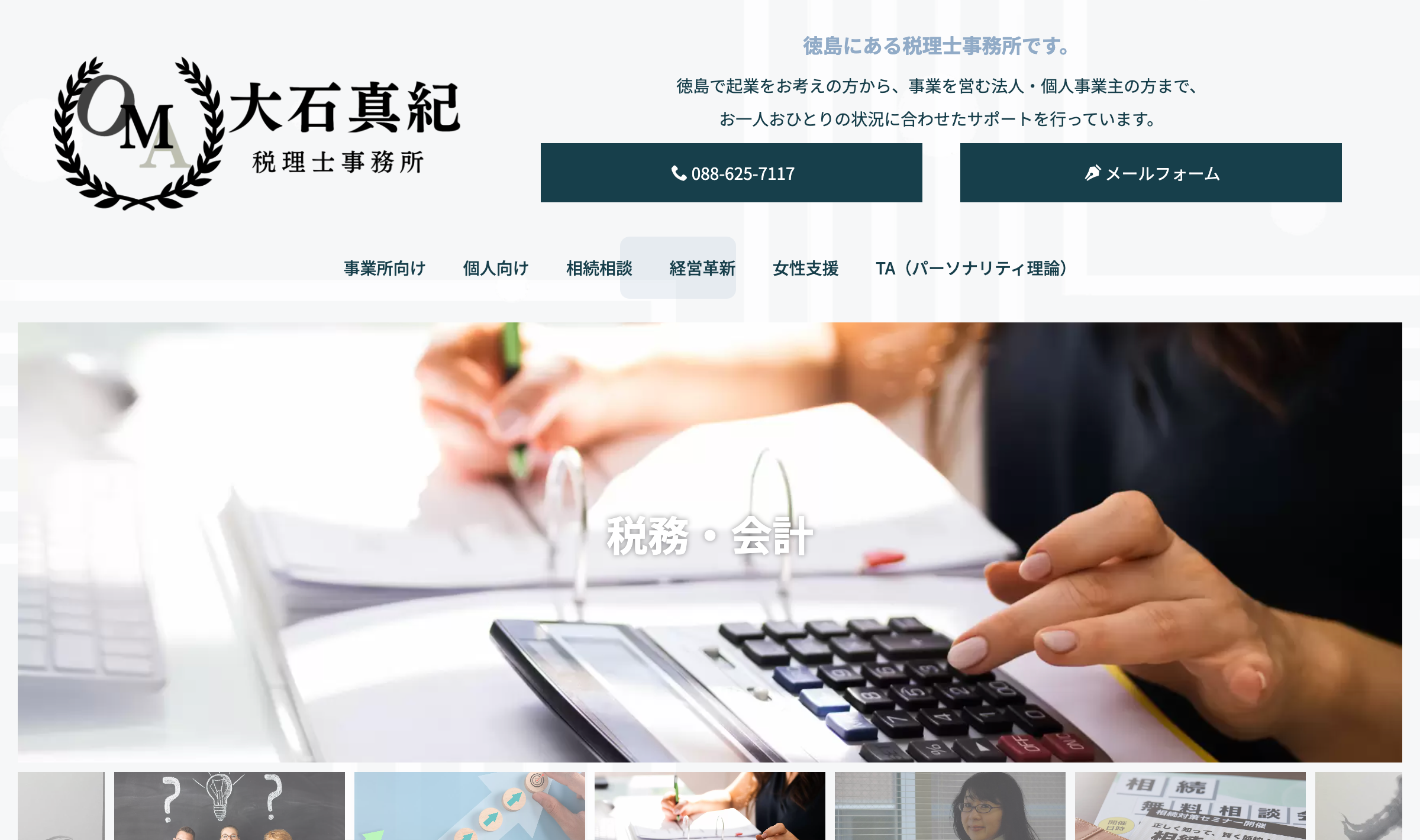 大石真紀税理士事務所は、「数字の先にある人の想い」に寄り添うことを大切にする、徳島市の地域に根ざした身近な税理士事務所です。起業から相続まで、人生と経営を支える税の専門家として、法人・個人事業主、個人の方のお一人おひとりの状況に合わせた最適なサポートを行っています。実務経験豊富なメンバーが、TA(パーソナリティ理論)を活用した「人を活かす経営」支援など、幅広い分野に対応しています。