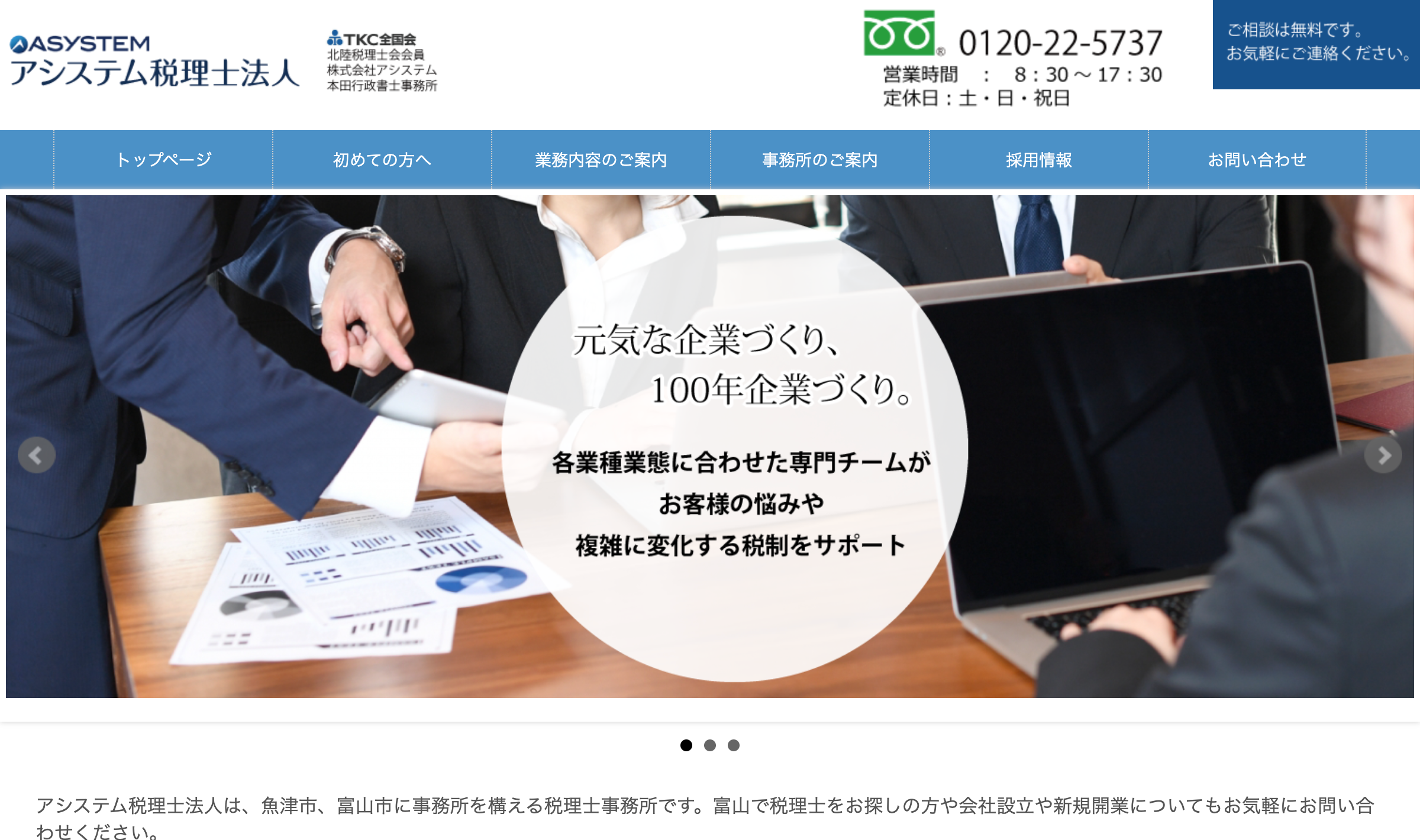 富山県内の魚津市と富山市に事務所を構えるアシステム税理士法人は、お客様の永続的発展とスタッフ一人ひとりの自己実現を願う、北陸最大級の税理士事務所です。お客様に喜ばれる仕事を目指し、税金や資金、人・組織の問題解決、経営計画策定指導などを通じて、安定成長企業の実現をサポート。総勢48名のスタッフが現場第一主義で毎月訪問し、経営課題を迅速に捉えて打つべき対策を提案します。
