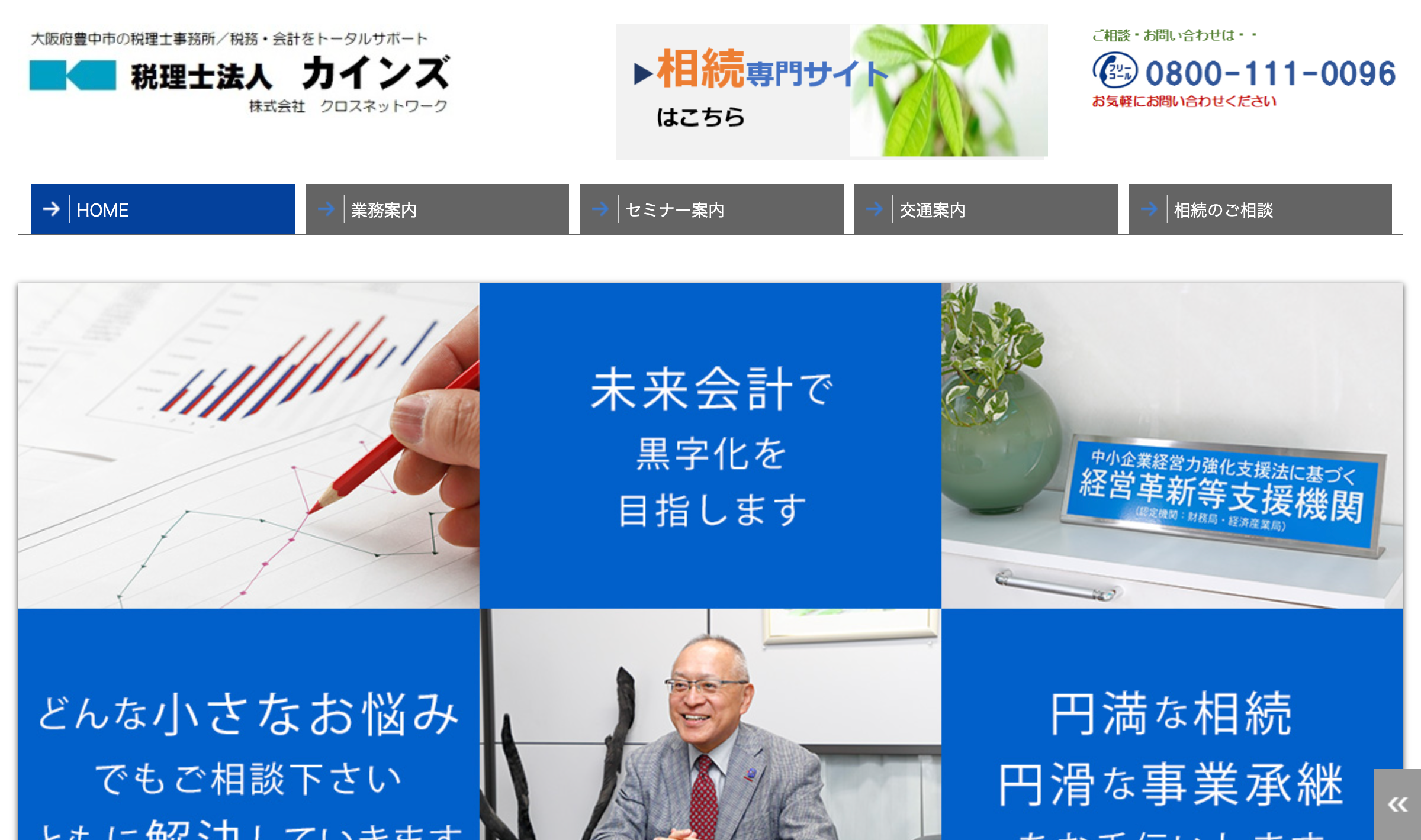 豊中市にある税理士法人カインズは、相続・事業承継と企業税務に特化した税理士法人です。経営革新等支援機関の認定を受けており、経営改善計画の策定支援をはじめ、黒字化のための適切な経営メニューを提案します。また、「相続・事業承継は、人生の集大成、愛のバトンリレー」を信条とし、不動産コンサルタントによる所有財産の検証など、最大限の節税と円満な相続・事業承継の実現をサポートします。